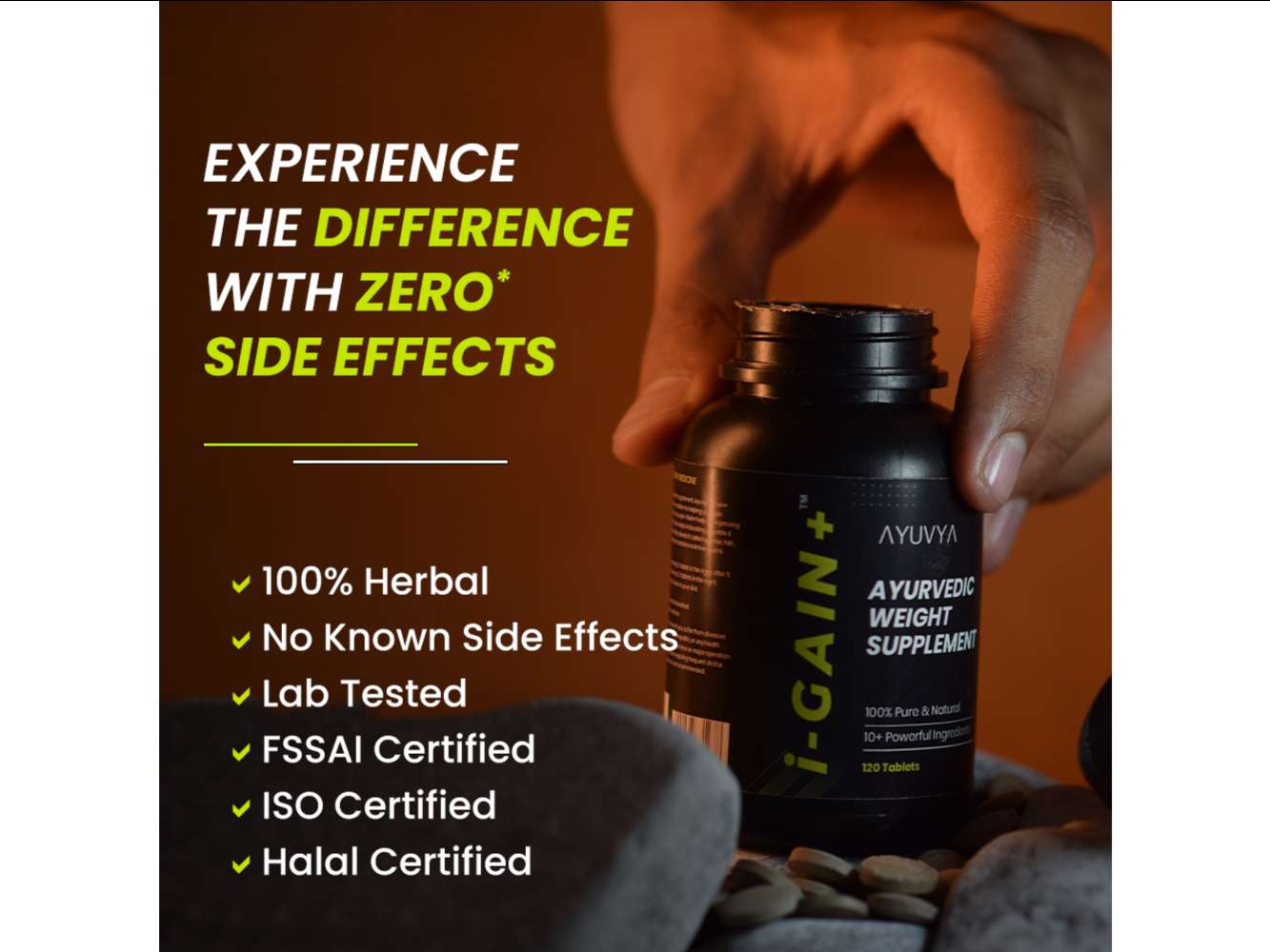 Product Description: Everyday we strive to be better and give our customers the best, and we have done just that! i-Gain+ comes with a new and improved formula, with superior ingredients and the power of Ayurveda. Ayuvya has combined traditional Ayurveda with novel technology to give us the best of both. i-Gain+ is the Ultimate weight gainer; with the power of Ahwagandha, Amla, Narkachoor and Kali Harad, it is the perfect companion for your weight gain journey. It helps gain muscle mass, improves digestion and boosts immunity by better nutrient absorption and increased metabolism. i-Gain+ leads to increased appetite and better digestion, which helps you incorporate more proteins and carbohydrates in your diet to tip your weighing-scale on the heavier side naturally. Gain weight, muscle-mass and immunity with i-Gain+. Ingredients: Ashwagandha, Amla, Kali Harad, Safed Musli Potent Ayurvedic Blend: I-Gain+ combines Ashwagandha, Amla and other herbs, offering a 100% Ayurvedic solution which helps in weight gain and muscle building, making it the one of best ayurvedic weight gainer for men and women. Helps in Enhanced Muscle Mass and Size: With its unique blend of ingredients, I-Gain+ helps in facilitating the development and toning of muscle size, making it an ideal choice for those seeking muscle gain capsules or muscle gainer tablets. Helps in Appetite Boosting: I-Gain+ helps to stimulate appetite, aiding in consuming protein-rich foods necessary for weight gain, making it the perfect choice for weight gain tablets for female and male customers. Helps in Improving Digestion and Metabolism: I-Gain+ promotes better digestion, metabolism and also helps in optimal nutrient absorption, making it one of the best ayurvedic weight gainer capsules for men and women. Safe and Effective: As an 100% Ayurvedic supplement, I-Gain+ is free from known side effects, offering a safe and reliable option for individuals seeking weight gain, making it one of the top choice among weight gain products. Direction of Use: ✅First 15 Days, Start With 1 Tablet: Take 1 tablet after breakfast & 1 half an hour before dinner. ✅After 15 Days, Start Taking 2 Tablets: Take 2 tablets after breakfast & 2 tablets half an hour before dinner. ✅Once you start taking i-Gain+, you will experience increased appetite – for that start adding protein-rich food like beans, lentils, chicken, paneer, and nuts, etc to your diet. ✅For getting maximum results – Start with light exercises or strength training.It’s time to look fitter, better & stronger with Ayuvya i-Gain+.