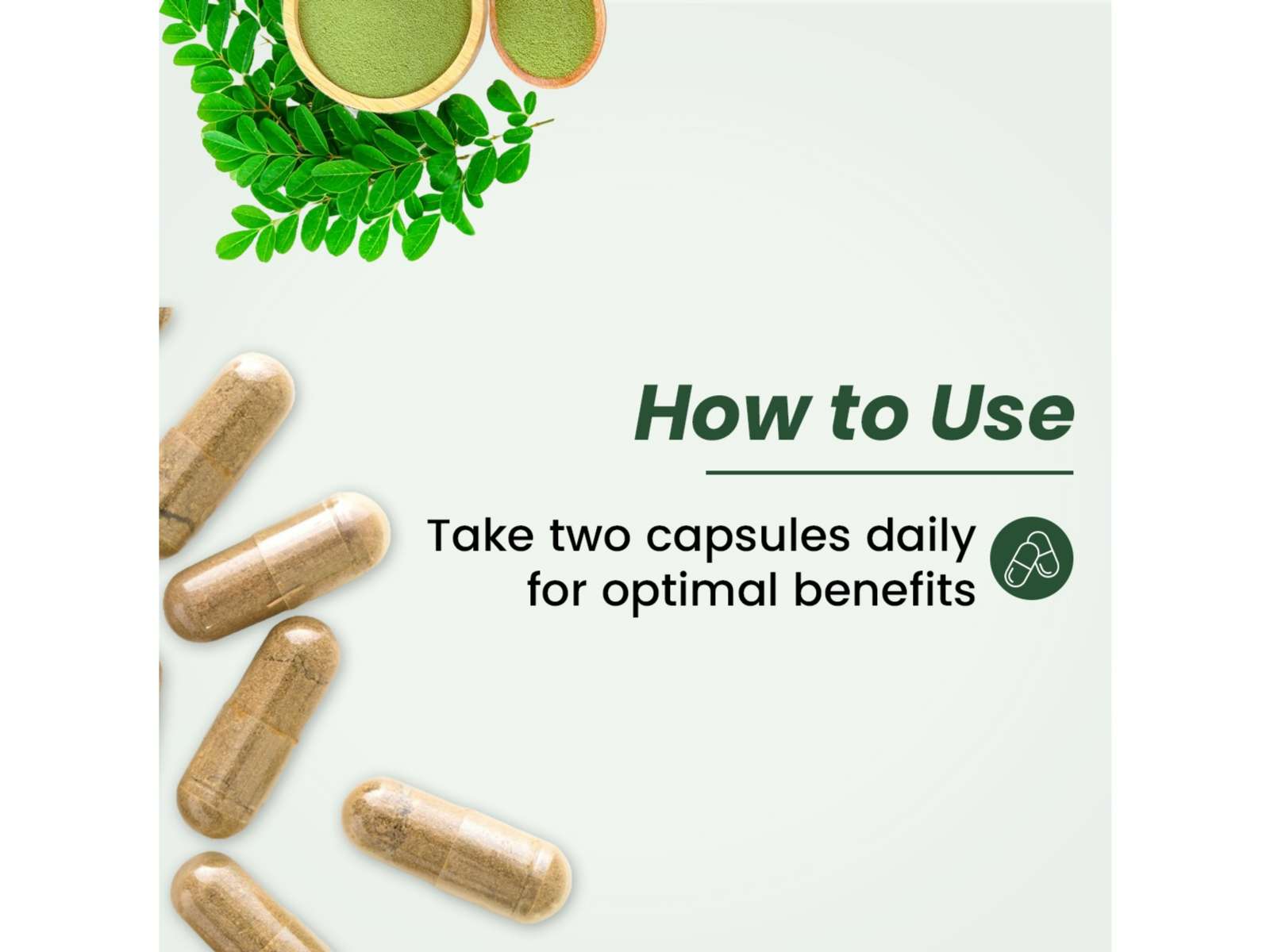 Product Description: Our Moringa Capsules bring the pure essence of Moringa oleifera to you in a convenient, easy-to-take form. Each capsule is packed with the nutrient-dense benefits of fresh Moringa leaves, providing a potent blend of vitamins, minerals, and antioxidants. Designed to support your overall health, these capsules offer a natural boost for immunity, digestion, and vitality, helping you stay balanced and energized every day. Ingredients: Moringa PREMIUM MORINGA OLEIFERA: Each capsule contains 500mg of Ayush-certified Moringa (Drumstick) leaf powder extract, offering a potent dose of this nutrient-dense superfood known for its numerous health benefits and weight management support. POWERFUL IMMUNITY BOOSTER & NUTRITIONAL POWERHOUSE: Our Moringa capsules are packed with essential vitamins, minerals, and antioxidants, supporting overall health and strengthening your immune system to help defend against illnesses and infections naturally. PROMOTES HEALTHY SKIN & HAIR: The rich nutritional profile of our Moringa powder contributes to healthier skin and hair, offering beauty benefits from the inside out. Experience the natural glow and strength that comes from nourishing your body with this potent superfood. SUPPORTS WEIGHT MANAGEMENT & METABOLISM: Moringa is known for its potential to aid in weight loss by boosting metabolism and reducing cravings. Our easy-to-take capsules make it simple to incorporate this powerful herb into your weight management routine. VERSATILE AYURVEDIC SUPPLEMENT: Whether you’re looking for Moringa leaf powder, tablets, or capsules, our product offers a convenient way to incorporate this nutrient-rich superfood into your daily wellness regimen, supporting overall health and vitality. Direction of Use: Take 1 capsule twice daily, preferably after meals.