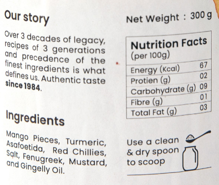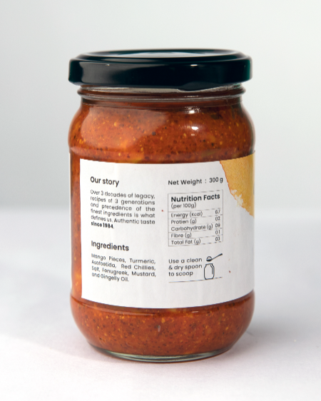 Authentic taste: Our Mango pickle is made using a traditional recipe that’s been passed down through generations. It’s the perfect combination of tangy and spicy, with a distinct flavor that’s sure to tantalize your taste buds. No artificial preservatives: We take pride in using only natural ingredients in our Mango pickle. It’s made without any artificial preservatives, ensuring that you enjoy a healthy and tasty meal. High-quality ingredients: We use only the freshest and highest quality mangoes, spices, and oils in our Mango pickle. You can taste the difference in every bite. Handcrafted with care: Our Mango pickle is handcrafted with care, using traditional methods that ensure the best taste and texture. Each jar of pickle is made in small batches, so you know you’re getting a fresh product. Versatile: Our Mango pickle is a versatile condiment that can be used as a side dish. It’s perfect for adding a burst of flavor to your meals. Ingredients: Mango Pieces, Salt, Turmeric, Red Chillies, Sesame Oil, Fenugreek, Mustard, Asafoetida Did you Know: Mangoes are a rich source of vitamins and antioxidants. It helps in improving eye health and improves skin health. Our pickle retains the nutritional benefits of mangoes, making it a healthy addition to your diet. Long shelf life: Our Mango pickle when used with dry spoon has a long shelf life and can be stored in a cool, dry place for up to 12 months. You can enjoy the taste of India all year round! Don’t settle for bland meals. Elevate your dishes with the taste of our Mango pickle. Order now and taste the difference!