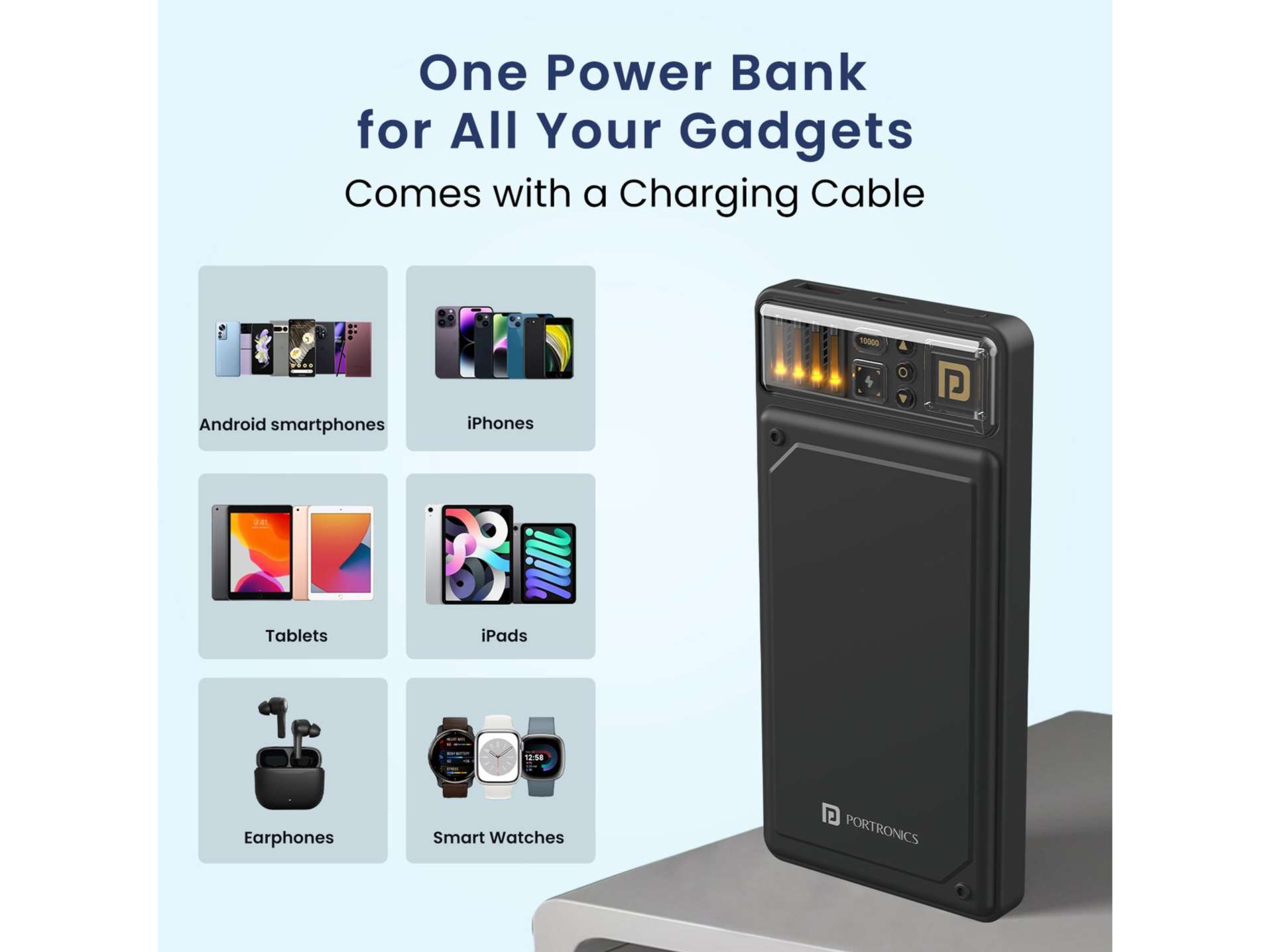 Long Battery Life & High Capacity: Avail the freedom of 3 months of use before needing to recharge. The Luxcell C power bank’s long-lasting 10000mAh capacity ensures your devices stay powered for extended periodsperfect for travel, daily use, and emergencies Fast Charging with 22.5W Max Output: Equipped with a high-performance 22.5W Max Output, the Luxcell C supports fast charging for smartphones, tablets, and other devices. For optimal performance, maximize efficiency with a compatible USB cable. Sleek & Compact Design: The Luxcell C features a modern, easy-to-carry design with a matte finish for a premium feel. Its lightweight and slim profile make it the perfect portable charging solution for on-the-go use. Mach USB-A Output: Charge your devices quickly with the universal USB-A output port. Type C PD Output: Deliver fast charging speeds with the latest Type C Power Delivery (PD) technology. Type C Input: Recharge your power bank in no time using the convenient Type C input, making it compatible with the latest tech devices. LED Indicator for Power Status: Stay informed with the built-in LED indicator showing the power bank’s remaining power level. Know when it’s time to recharge and keep your devices powered up. Durable & Sturdy Build: Designed with a rugged body, the Luxcell C ensures durability and longevity. The matte finish adds an extra layer of protection against scratches and fingerprints. 12 months Warranty Importer/Manufacturer/Packer : Portronics Digital Private Limited, Ground Floor and First Floor, Property No. D 8 Upper Basement, Sector 8, Noida, Gautam Buddha Nagar, Uttar Pradesh, 201301