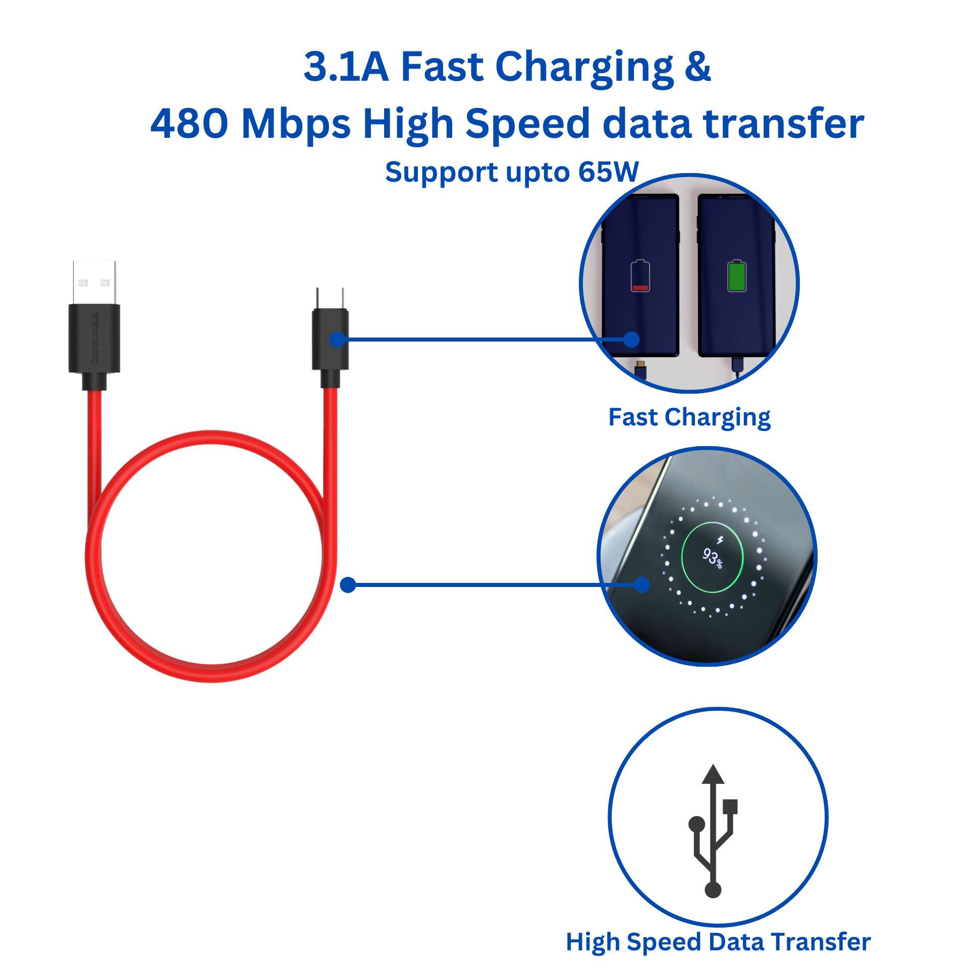 Twance T24R TPE – Type C to USB charging and data transfer Cable, 2 Meter Length, Red color, Fast Charging , 3.1A, High speed data transfer 480mbps, 6 months warranty, Suitable for all android smartphones, Laptop, tablet, power bank, any other with C port enable device, Make in India