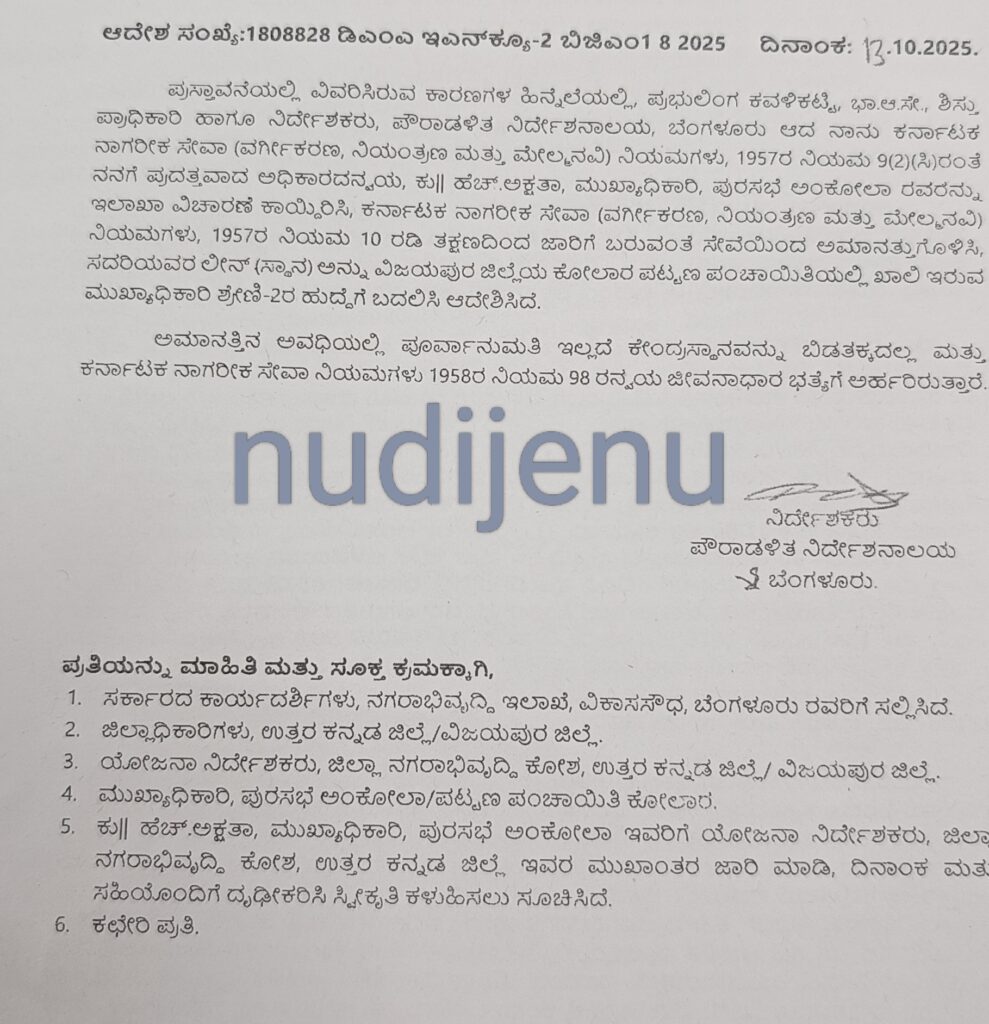 ಪೌರಾಡಳಿತ ನಿರ್ದೇಶನಾಲಯದ ಶಿಸ್ತು ಪ್ರಾಧಿಕಾರಿ ಹಾಗೂ ನಿರ್ದೇಶಕರಾದ ಪ್ರಭುಲಿಂಗ್ ಕವಳಿಕಟ್ಟಿ ಆದೇಶ ಹೊರಡಿಸಿದ್ದಾರೆ.
